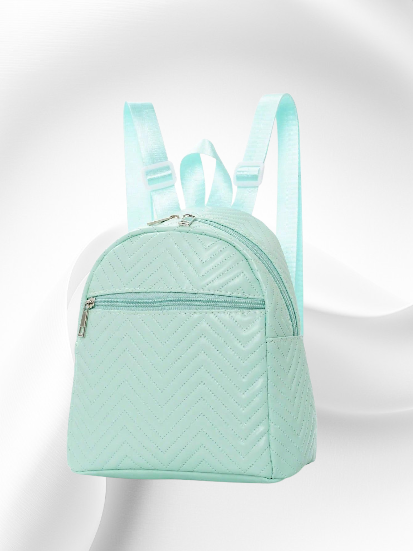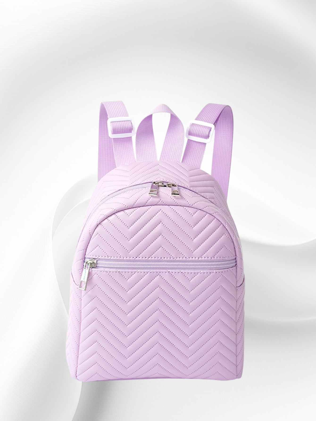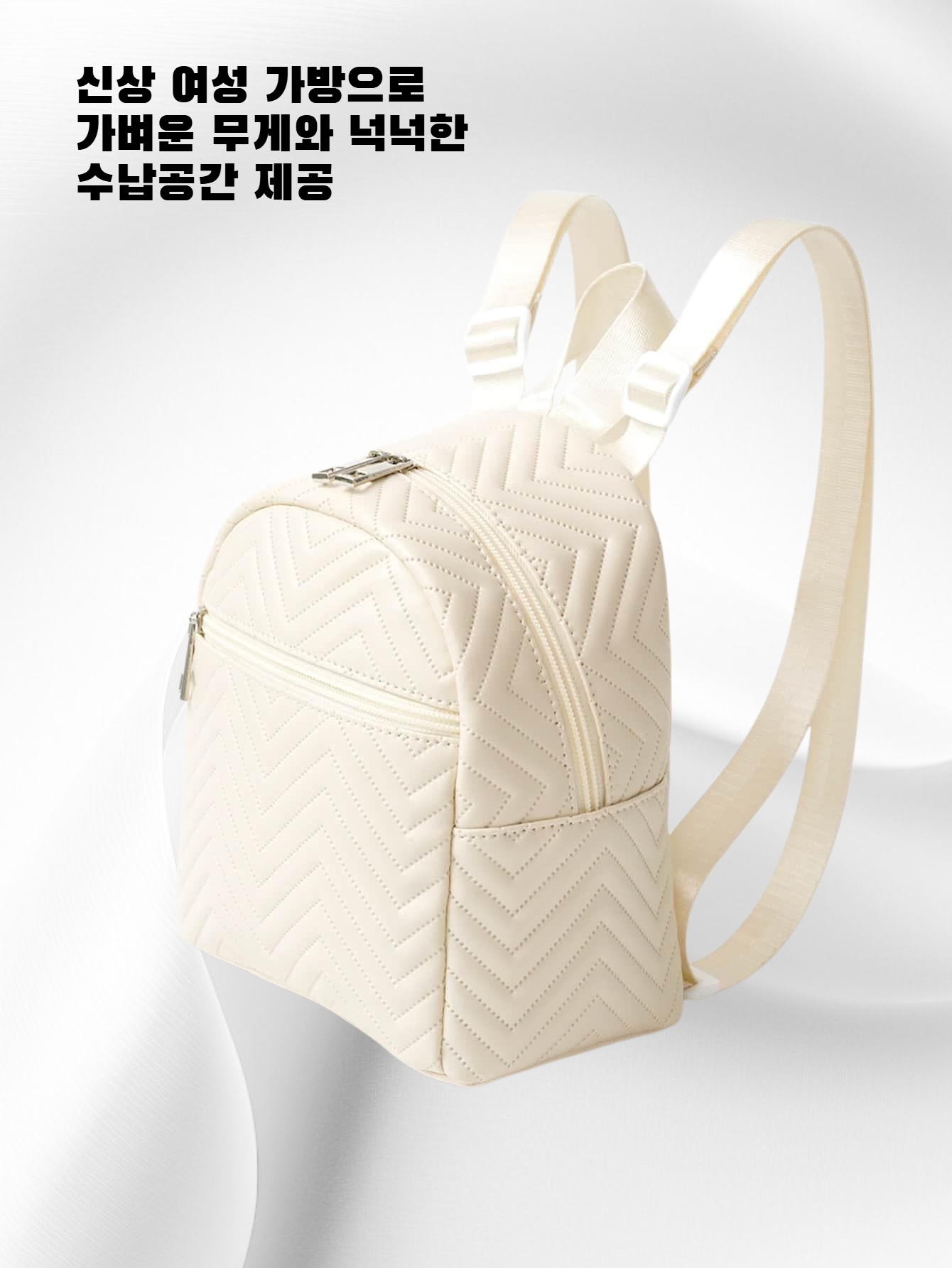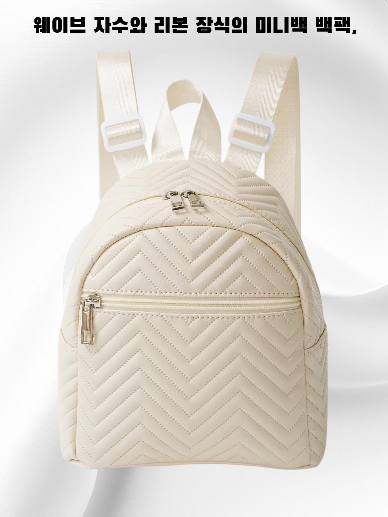 웨이브 자수와 리본 장식으로 포인트를 준 신상 여성 미니백. 백팩 스타일로 실용성 높음. 데일리룩, 데이트룩에 잘 어울림. 가벼운 무게와 넉넉한 수납공간 제공.