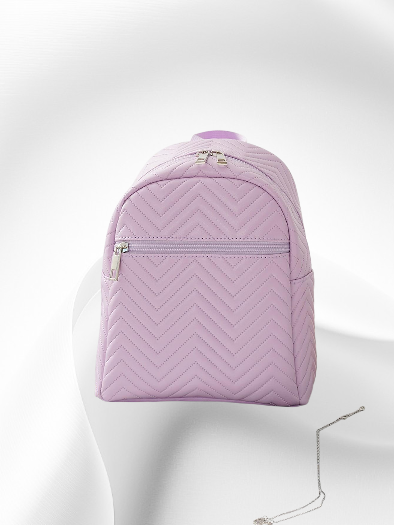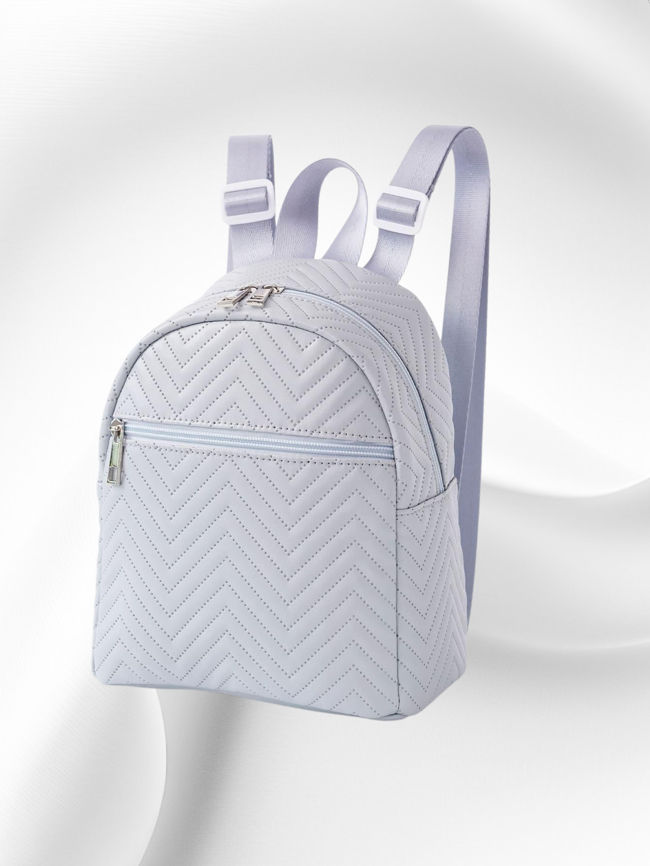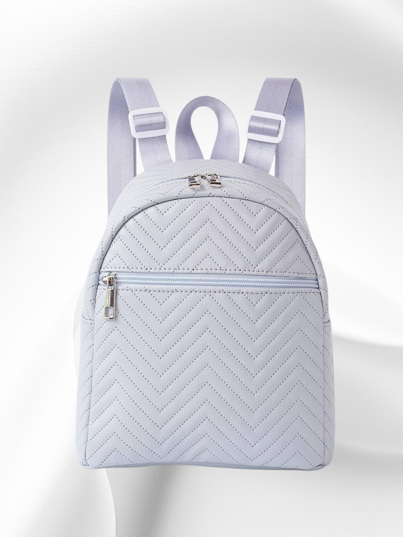 웨이브 자수와 리본 장식으로 포인트를 준 신상 여성 미니백. 백팩 스타일로 실용성 높음. 데일리룩, 데이트룩에 잘 어울림. 가벼운 무게와 넉넉한 수납공간 제공.