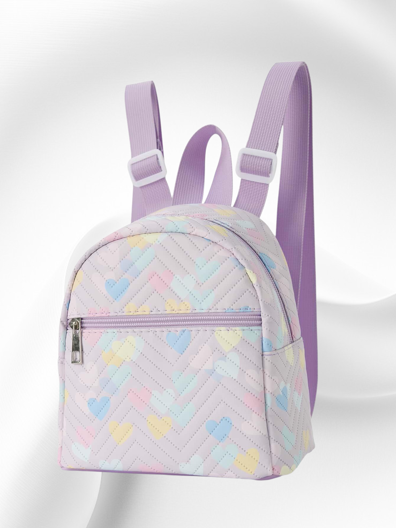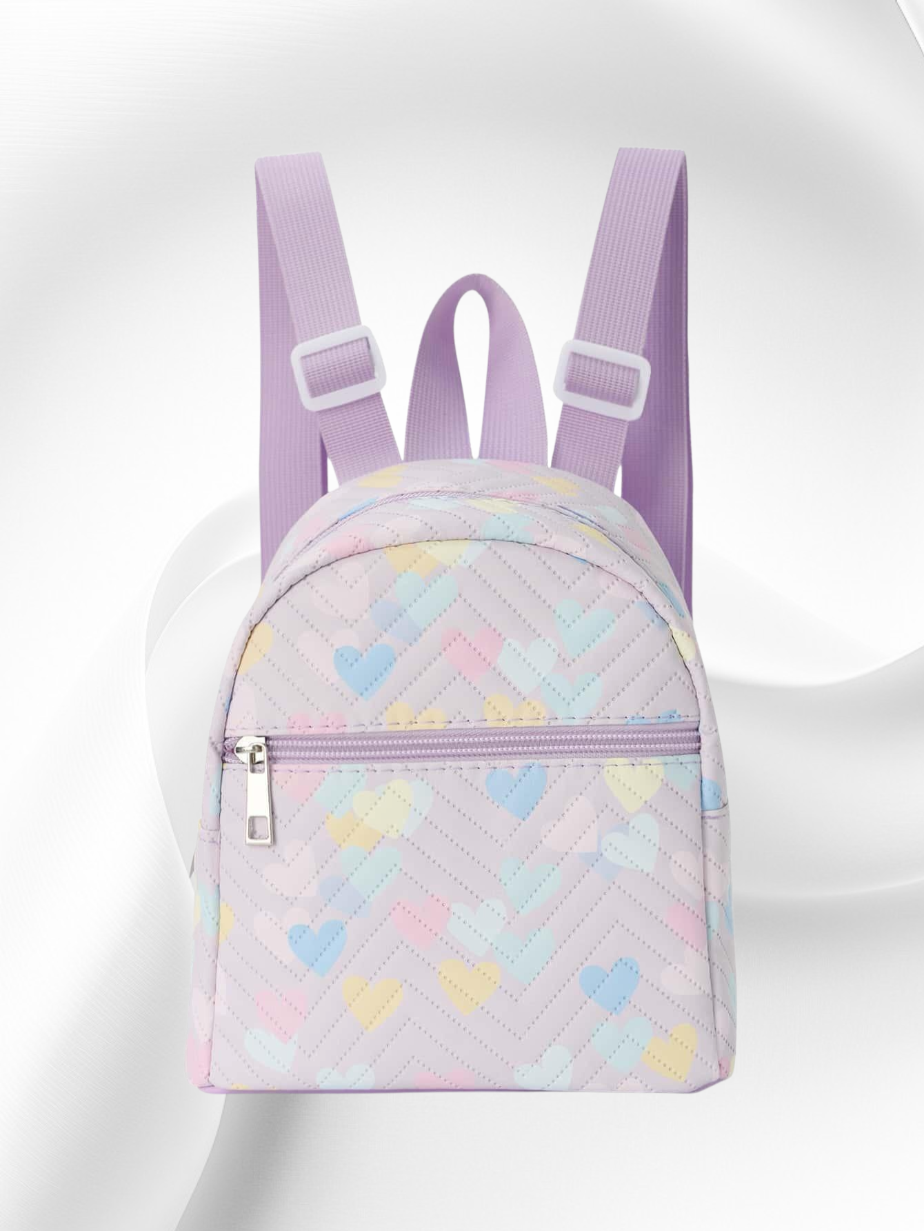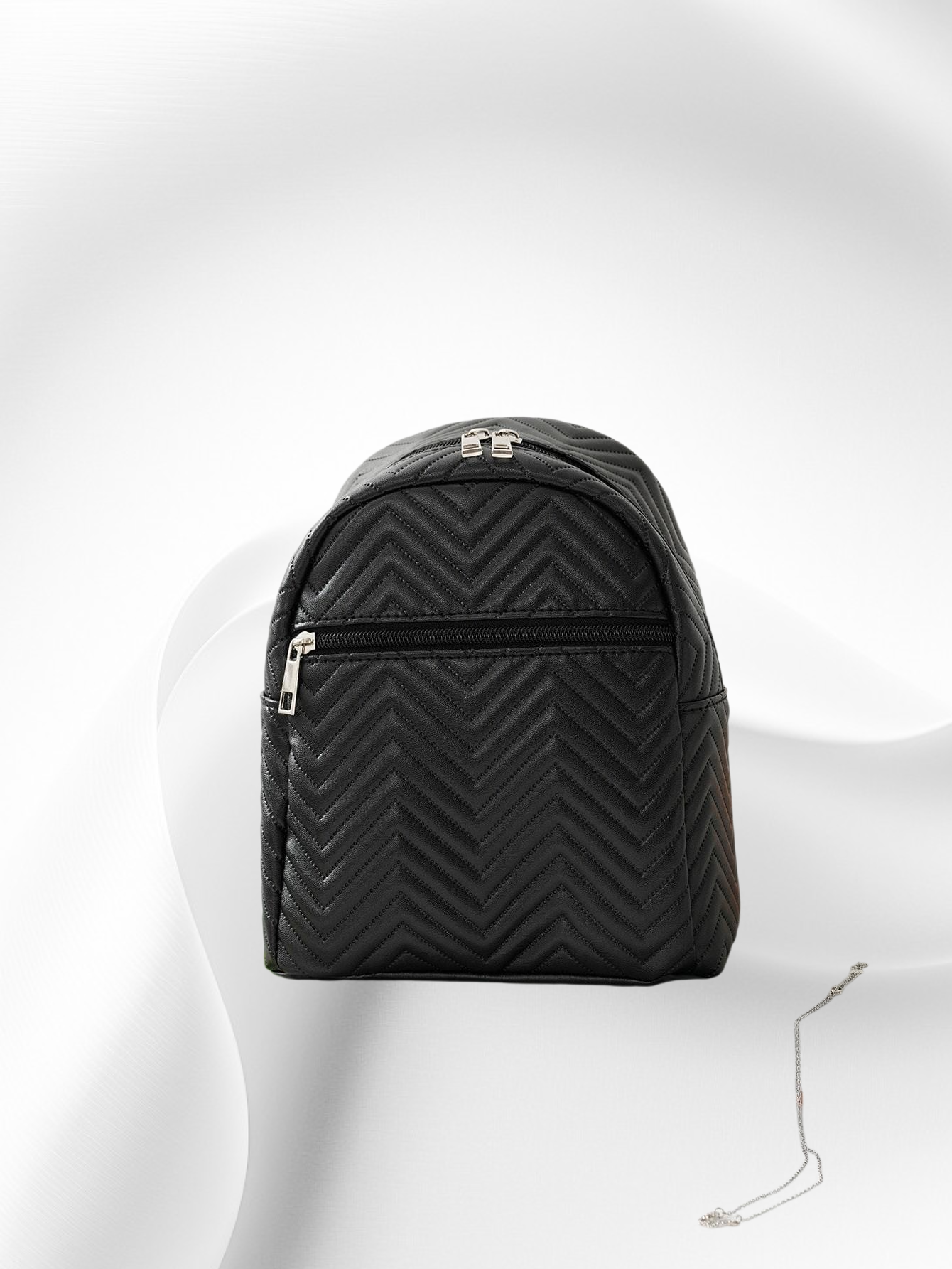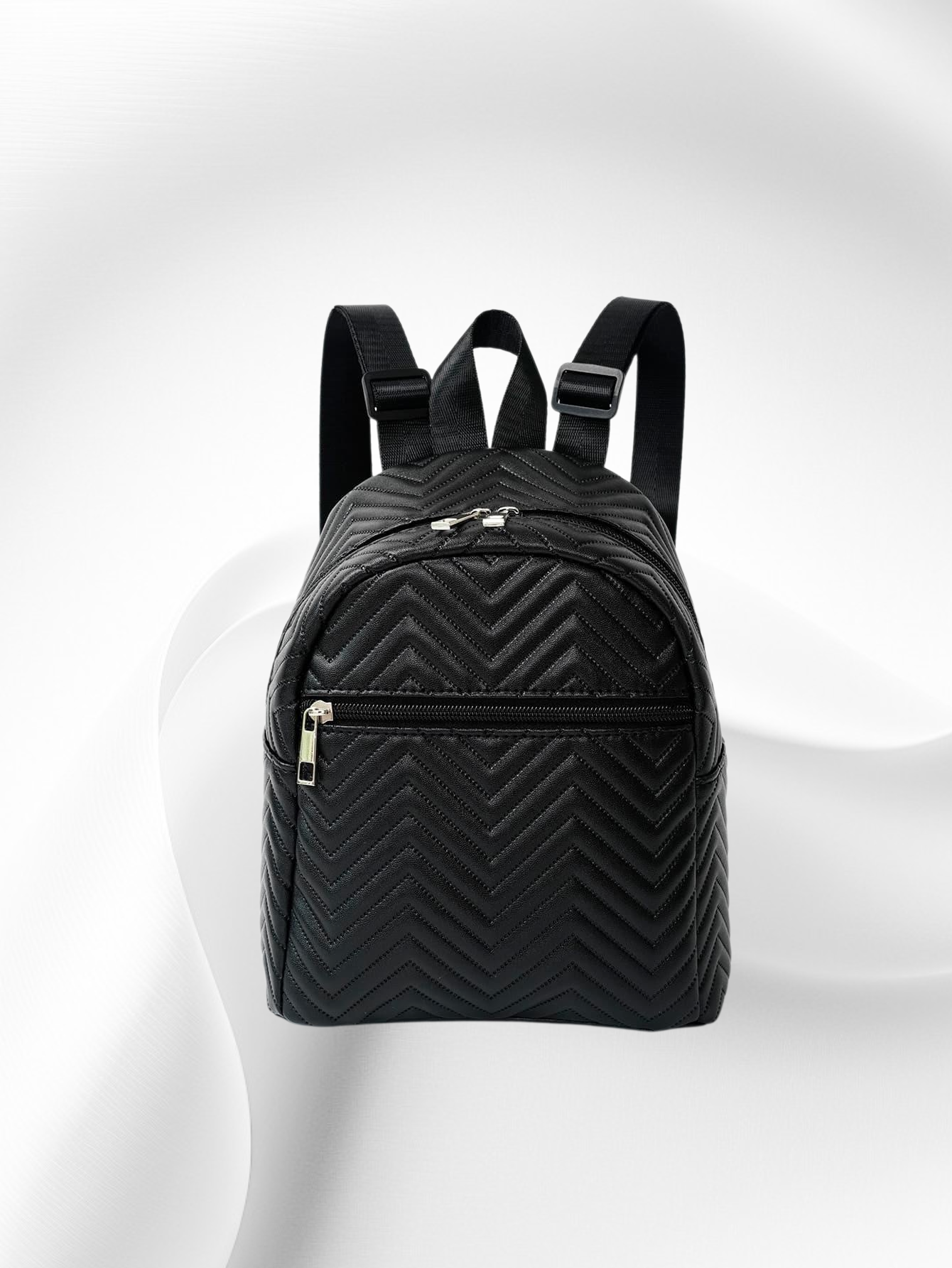웨이브 자수와 리본 장식으로 포인트를 준 신상 여성 미니백. 백팩 스타일로 실용성 높음. 데일리룩, 데이트룩에 잘 어울림. 가벼운 무게와 넉넉한 수납공간 제공.