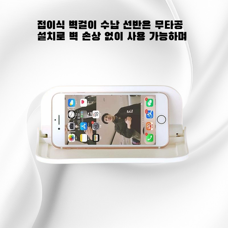 접이식 벽걸이 수납 선반은 무타공 설치로 벽 손상 없이 사용 가능하며, 화장실, 침대 머리맡 등 다양한 공간에 휴대폰, 셋톱박스 등 소지품을 깔끔하게 정리할 수 있음.