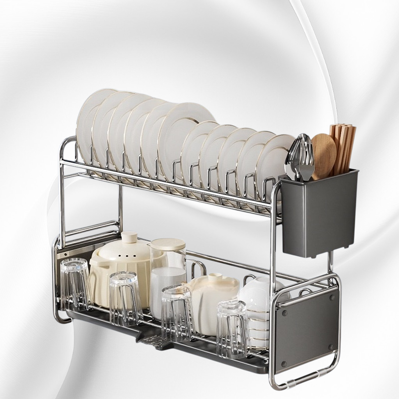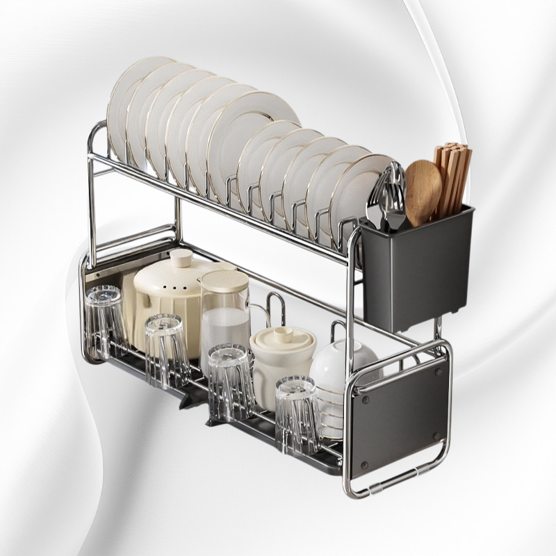 304 스테인리스 소재로 내구성이 뛰어나며, 주방 싱크대에 적합한 접시 및 수저 정리 건조대입니다. 녹 방지, 위생적 보관, 공간 절약 설계.